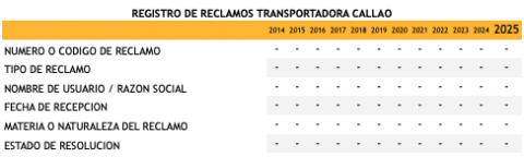 Transportadora Callao cuenta con una sola dependencia ubicada en: Av. Contralmirante Mora 590, Callao. En este lugar se puede recabar el texto completo del Reglamento de Atención de Reclamos y Solución de Controversias de OSITRAN. Asimismo, contamos con una Mesa de Partes Virtual: mesadepartes@ctcallao.com.pe El plazo máximo para presentar reclamos es de 60 días hábiles. Los reclamos de usuarios serán resueltos en primera instancia por la Gerencia de Operaciones. La Gerencia de Operaciones se encuentra representada por el Sr. Gustavo Flores M. La Gerencia General se encuentra a cargo del Sr. Víctor Sam. Nota: En Mesa de Partes de esta dependencia se puede recabar copia del Reglamento de Atención de Reclamos y Solución de Controversias del OSITRAN. |